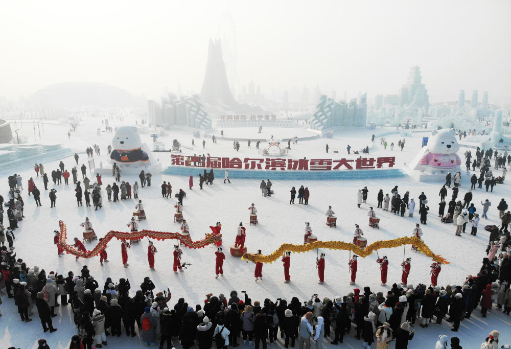 2月10日,游客在哈尔滨冰雪大世界园区内观看舞龙表演。新华社记者王建威 摄